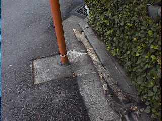 真ん中に写っている橙色の棒はロードミラーの支柱である。そこに、なぜか、枯れ木がヒモでつながれている。???