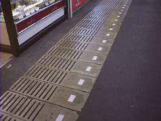 本来、線路が来るはずであろうところに、プレハブで売店が立ち、電車が来た時にはこれより後ろに下がらなくてはいけないと言われる白線が孤立したものである。