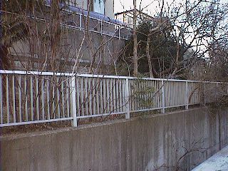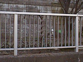 川沿い(と言っても、自然な川ではなく、かと言って、土手や河川敷があるわけでもなく、コンクリの水路に囲まれた極めて人為的ドブ川なんだけど)に歩いてみる。その気で入る人がなければ、そんなところに柵は必要なかろうと言いたい所にも柵がある。
