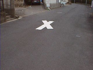 左後方から合流してくる道路に平行に書いたんで、歩行者の視線から見ると、斜めになっちゃって、入っちゃいけないゼブラゾーンみたい。