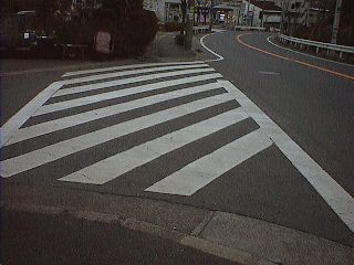 でも、この手のねじれを見せる歩道は結構多い。線の引きかたに基準はないのだろうか。でも自動車から見て真っ直ぐな方がドライバーの目の錯覚を防ぐのかもしれん。