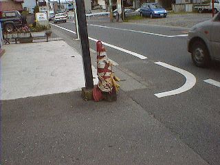 木製の電柱のなれの果てか、阿部定物件が、三角コーンを被っている。