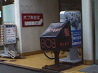 隣に理容室「スーパーカット」が営業中だが、この看板は2Fのボブ美容室の看板である。
