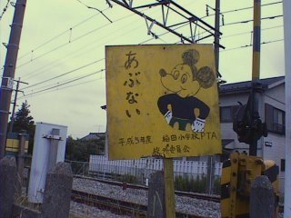 踏切の傍で「あぶない」と言うわりに、腰に手をやって、結構悠長なポーズのこの方。
