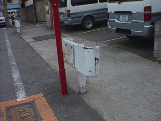 妙に短いガードレール。しかも、消火栓表示の標識の影に隠れている。