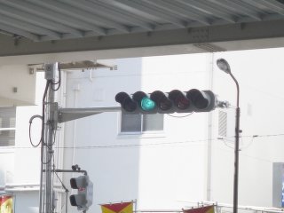 青は「進んでよし」、黄色は「注意」、赤は「止まれ」。しかし、その外側にも、左右それぞれ一個余分についている。もしや、白「駆けぬけろ」、黒「下がれ」とか?