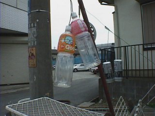 桃とカルピスと一緒に、絞首刑にあっている。幼児虐待である。はたして、地面に置かれたペットボトルはネコ避けと聞くが、宙に吊らされたボトルはなに避けなんだろうか。
