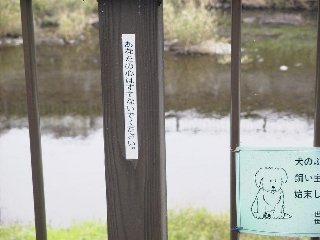 なんて川岸で書かれてもぉ〜。なんだか、ひどく重い気がするなぁ。川の環境に限って言えば、心よりも、ゴミを捨てないでと言う方が大事だろう。すぐ横には、犬のフンの始末のカンバンも出ている。