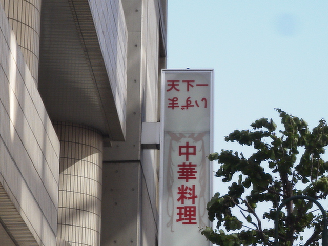 おそらく、「まずい」をひっくり返して、うまいといいたいのでしょうが、いまひとつな感じです。古本屋さんのカンバンで「本」がひっくり返ってる方が、まだ許せます。